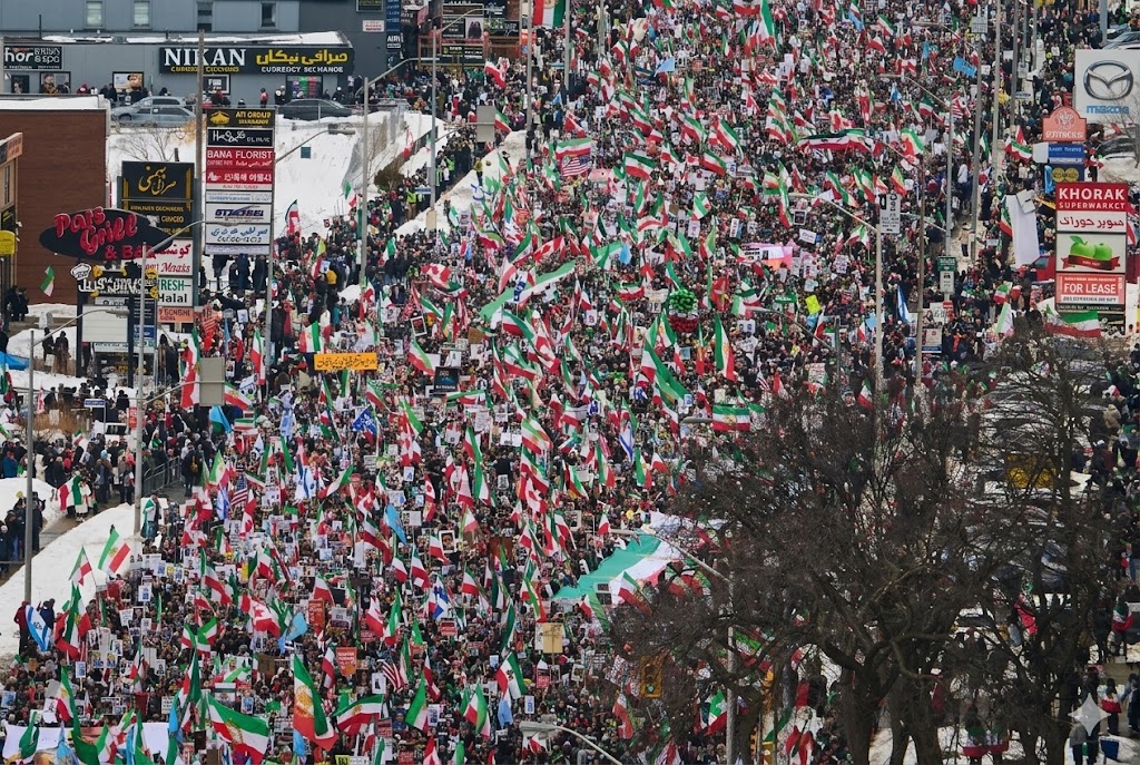 ஈரானில் தற்போதுள்ள ஆட்சிக்கு எதிராக Richmond Hill-இன் Yonge Street வழியாக ஆயிரக்கணக்கான மக்கள் பேரணியாகச் சென்றனர்.