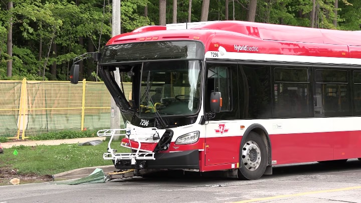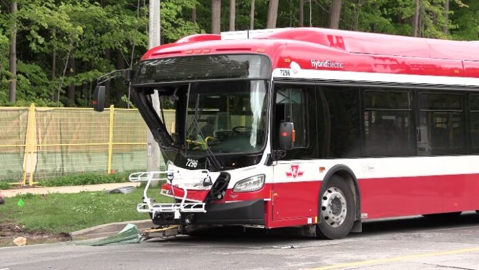 இந்த சம்பவம் வெள்ளிக்கிழமை பிற்பகல் கிப்லிங் அவென்யூ அன்ட் எக்லிங்டன் அவென்யூ வெஸ்ட் சந்திப்பில் நடந்தது. ஒரு பேருந்து மற்றும் இரண்டு கார்களும் இந்த விபத்தில் சிக்கியுள்ளன.